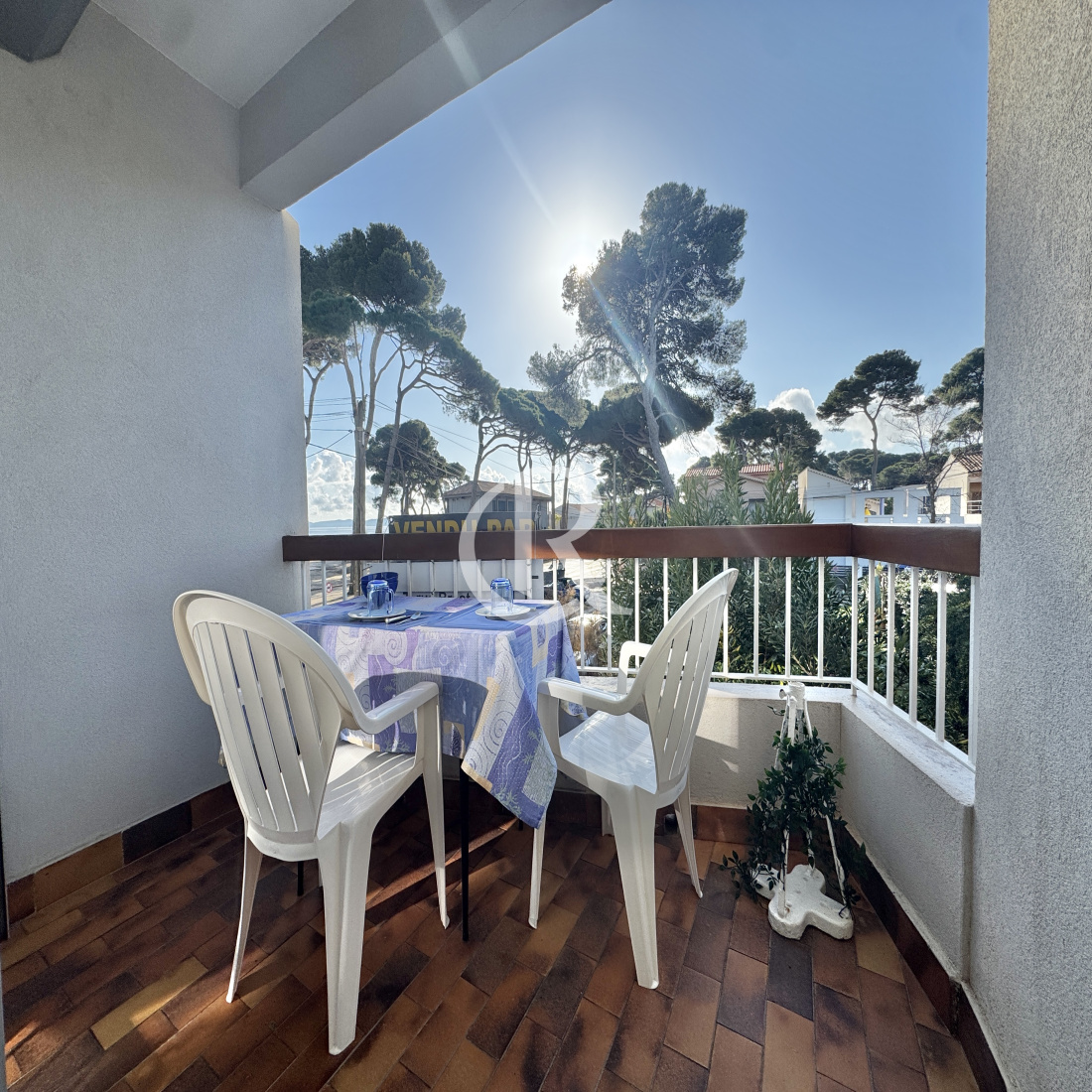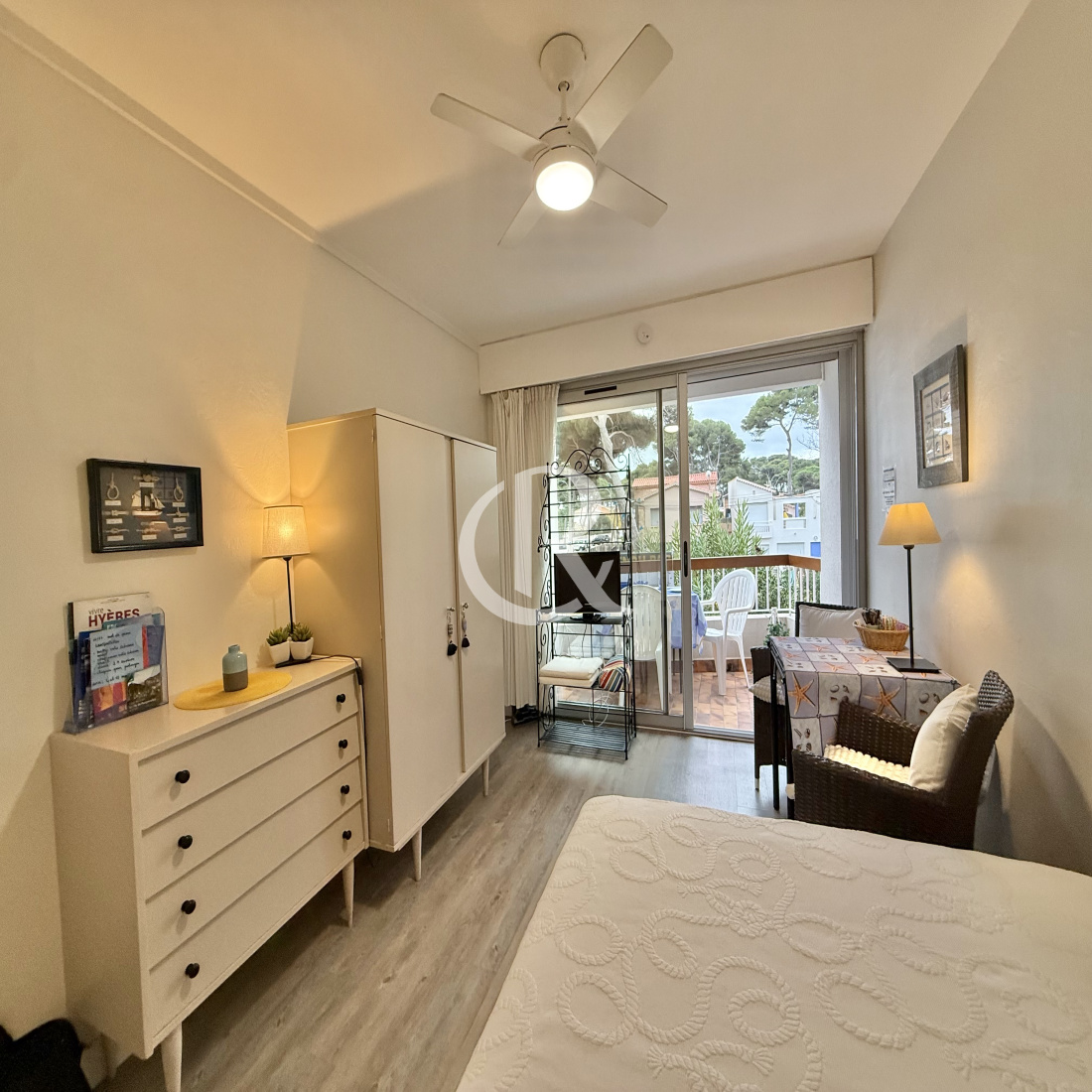 En dernier étage d'un petit immeuble à 20 m de la plage des Pesquiers, appartement de type 1 traversant Nord Sud vendu meublé et en excellent état. Il ouvre sur un balcon avec vue mer.