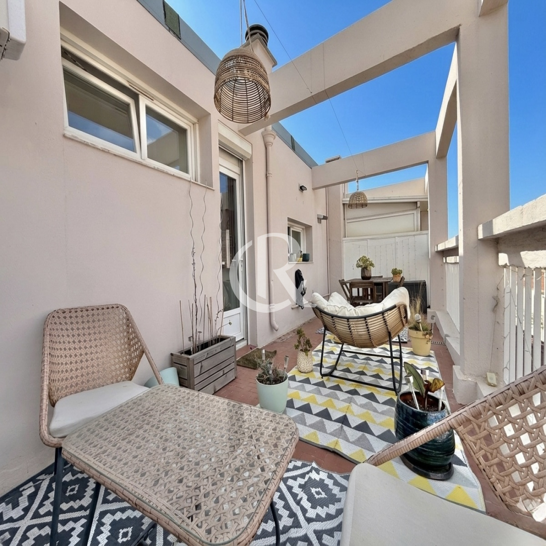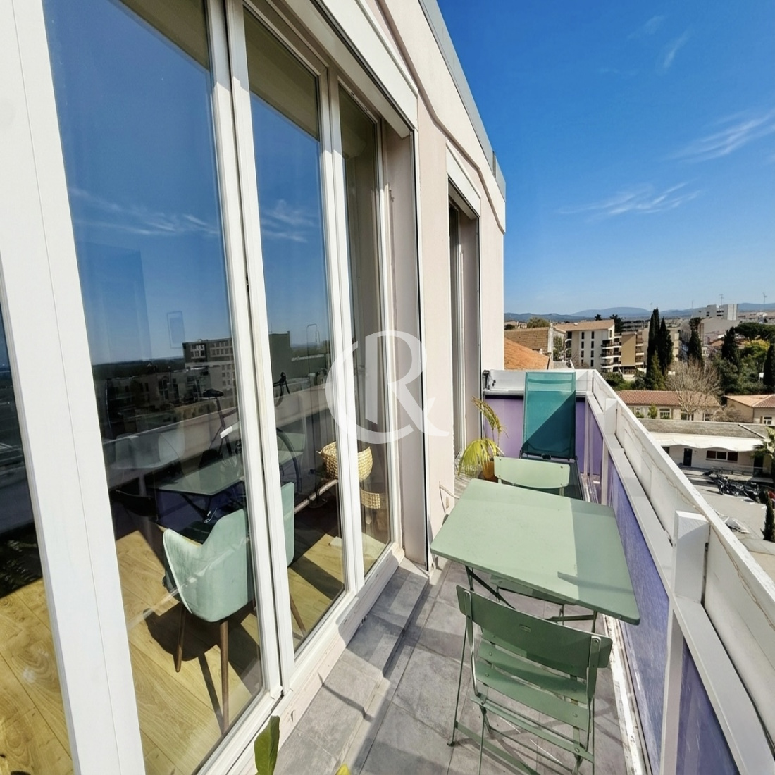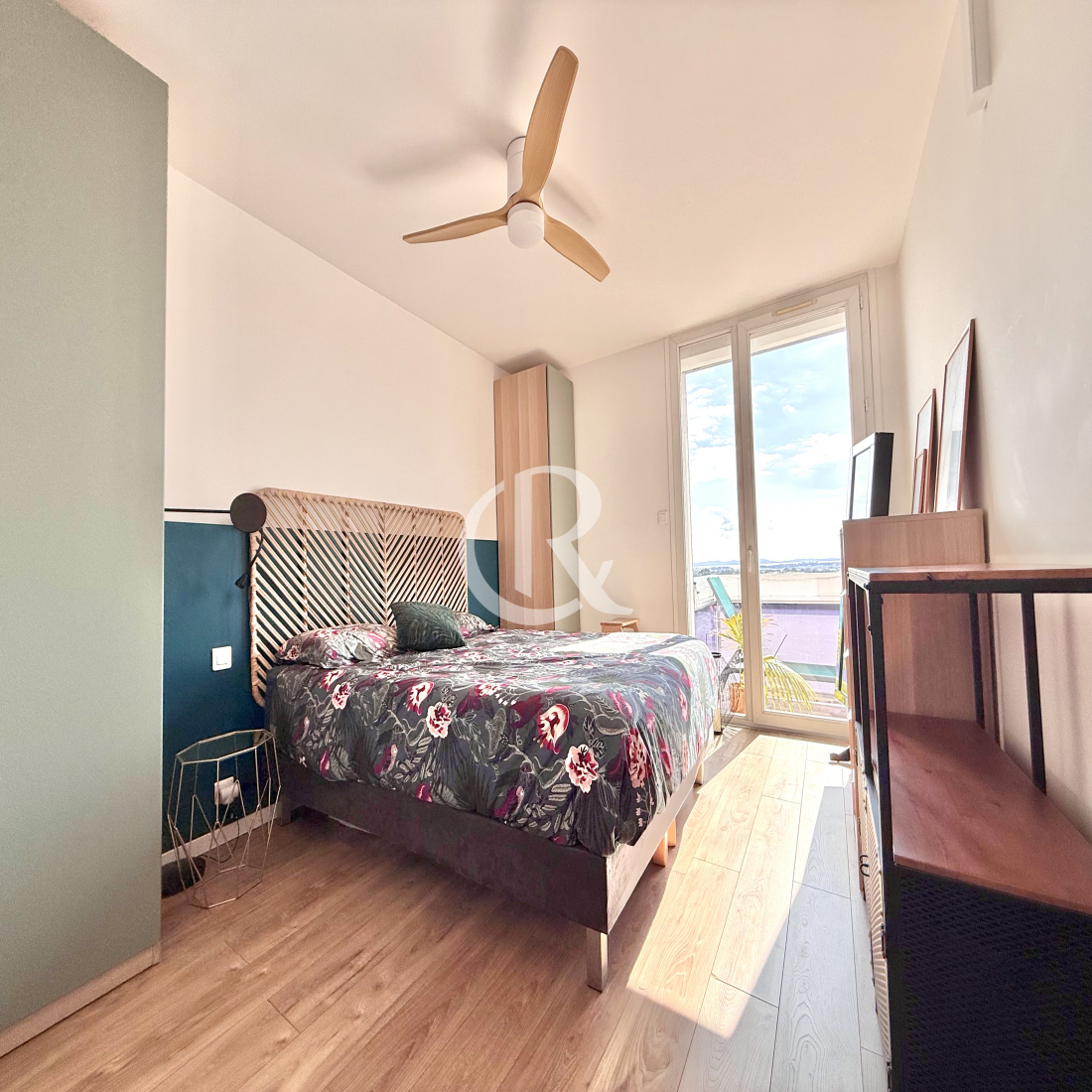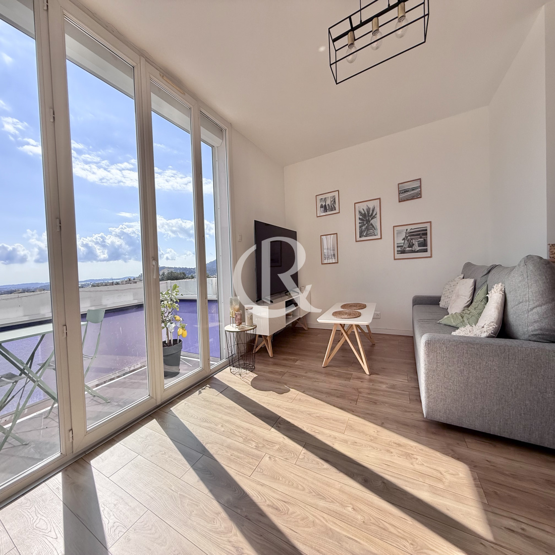 Situé au dernier étage d’une résidence avec ascenseur, en plein cœur du centre-ville, ce superbe appartement de type 2 traversant Nord-Sud séduit immédiatement par sa luminosité exceptionnelle et ses vues spectaculaires. Il ouvre sur une vaste terrasse de 20,50 m² ainsi que un balcon de 5,50 m², offrant une double perspective remarquable : d’un côté, une vue dominante sur le centre historique, et de l’autre un horizon dégagé s’étendant jusqu’à la mer. Baigné de lumière tout au long de la journée, l’appartement se présente en excellent état et bénéficie de prestations contemporaines de qualité : cuisine aménagée, double vitrage, climatisation réversible et volets roulants électriques. Un garage ainsi qu’une cave complètent ce bien rare, idéalement situé, alliant confort moderne, emplacement privilégié et vues d’exception.